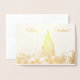 Diseño de Relieve metalizado dorado brillante con árboles brillantes, ¡hace una tarjeta atractiva para celebrar las vacaciones! ¡envía un saludo alegre a través de los kilómetros!