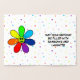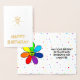 El interior tiene una flor sonriente con pétalos puntiagudos de arcoiris sobre un colorido fondo de puntos polka. El exterior tiene el mensaje "Feliz Cumpleaños" y la flor en Relieve metalizado.