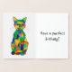 Una pintura de un gato arco iris. La versión exterior está en Relieve metalizado y la interior está en color de lluvia. El mensaje dice: "¡Que tengas un cumpleaños perfecto!"