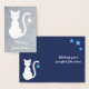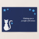 Un personalizado de silueta de un gato. El frente tiene al gato en Relieve metalizado. El interior tiene un gato blanco con ojos azules. Una estrella helada cuelga de la cola del gato. La parte delantera de la tarjeta dice "Feliz Navidad" y el interior dice "Deseándote un Navidad perfecto".