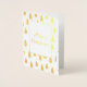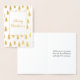 Esta tarjeta de Navidades presenta un fondo de abetos en un elegante Relieve metalizado dorado con un saludo de Feliz Navidad en el frente.