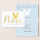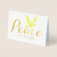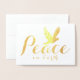 Una tarjeta de Relieve metalizado de oro con el mensaje de paz universal en tiempo de Navidad con las alas doradas de paloma estiradas sobre las palabras Paz en la Tierra en la portada y dentro de Goodwill to All en un suave fondo azul cielo. El mensaje dentro dice 'Feliz Navidad y Feliz Año Nuevo a Ti y a Ti' y firmó La Familia Jefferson cuyo nombre puedes alterar para que coincida con el tuyo con la herramienta personalizar. El pájaro Relieve metalizado dorado se repite en la parte posterior de la tarjeta. También puede cambiar el tipo de letra y el color de fondo.