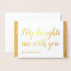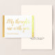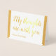 Este sencillo diseño de tarjetas de felicitación de simpatía por Relieve metalizado dorado incluye el mensaje "Mis pensamientos están contigo" en la parte delantera, junto con un mensaje personalizado en el interior. Una tarjeta como esta podría ser usada tal vez para ofrecer compasión a los parientes de alguien que ha fallecido recientemente.