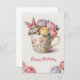 Una tarjeta de felicitación de cumpleaños con un ilustracion de acuarela muy divertido de un pequeño conejito con un arco rosa brillante que asoma desde el interior de una taza de café de cerámica y delicados rosas de colores pastel.