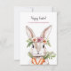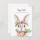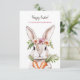 Conejo de Pascua con carta de zanahorias. Maravillosos colores primaverales en tonos rosa pastel, naranja y marrón, diseño floral acuarela y un conejito de bonito super lindo con dos zanahorias naranjas. Texto personalizado con un precioso guión de moda.