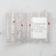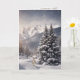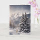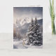 Pinos cubiertos de nieve y cumbres montañosas con copos de nieve y un lindo conejito. El texto se puede cambiar.