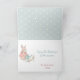 En la parte frontal de esta linda tarjeta de Pascua hay un conejo de Pascua antiguo vestido de verde teal y amarillo, y sentado junto a una cesta. Dentro de la cesta hay un pequeño pollito amarillo. El texto superior dice "Feliz Pascua" en rosa suave. Un marco de patrón rodea la imagen y el texto. Dentro hay más campos de texto personalizables en rosa y verde teal pastel. Hay otra imagen del conejo con una regadera en la parte inferior.