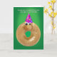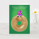 Una tarjeta de cumpleaños verde brillante con un gran donut con un Gorra de cumpleaños. El exterior plantea una pregunta, en funda te preguntaste si mirabas tu edad en tu cumpleaños... dentro diciendo, ... no, definitivamente ¡NO! Cumpleaños!
