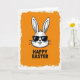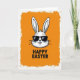 This card features a stylized white bunny head centered on a saturated orange background, with long ears reaching upward and a small smile that suggests a friendly, slightly flirty confidence 🐰. Dark sunglasses sit across its face, giving the character a cool, self-assured look, as if it’s sharing a private joke with someone close. Thick black outlines define the face and ears, and a single visible tooth adds a cute, teasing detail that can read like lighthearted romance or easy friendship. The orange backdrop isn’t flat; it has a worn, speckled texture that softens the scene and makes the character feel more approachable. Around the edges, irregular white splatters form a rough border, like paint dabs framing a poster. Near the bottom, a seasonal greeting is set in black sans-serif letters, centered and spaced for quick reading, with 🌷 adding a gentle spring touch. The high-contrast palette—white character, black linework and text, and the orange field—stands out sharply, with the white splatter border most noticeable along the top and sides.