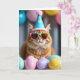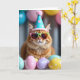 This card features a close-up portrait of a ginger cat in the foreground, its amber fur softly lit to show fine texture and a calm, slightly amused expression. A teal cone party hat with pink polka dots sits on its head, topped with a fluffy rose-colored pom‑pom, adding a light springtime mood 🌷. Pastel-tinted sunglasses cover the cat’s eyes, with frames shifting from soft pink near the nose to lime green at the outer edges, giving the face a friendly, teasing look as if sharing an inside joke. Near the top, small lettering in a pale pastel tone sits against the open background, leaving plenty of space around the cat’s head. Along the lower portion, a short line of text appears in a deeper contrasting color, centered above the blurred foreground shapes. In front of the cat, several smooth pastel eggs with tiny white dots fade into a soft blur, like little gifts set out for a friend 🐇. Behind it all, the background melts into out-of-focus round decorations in gentle spring colors, with the hat’s pink dots and the eggs’ speckles echoing each other across the scene.