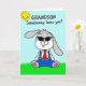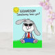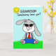 Designed with a cheerful cartoon look, this card features an upright grey hare centered on the front, with long ears showing soft pink on the inside 🐰. It wears a white collared shirt, a red necktie, and blue overalls with yellow fasteners, giving it a friendly, dressed-up look that feels ready for a sweet hello. Dark sunglasses sit across its face, and the small smile reads like a warm, affectionate grin shared with someone close. The background is split into two simple bands, with a sky-blue upper half and a green grassy strip along the bottom, like a sunny day outdoors 🌷. In the upper-left corner, a round yellow sun with a smiling face and short radiating lines looks down like a kindly companion. Any greeting text would sit neatly near the top against the sky-blue area, where white or dark lettering would stand out clearly without crowding the artwork. The sun’s bright yellow circle is edged by thin rays, while the grass forms a smooth green base beneath the hare’s feet.