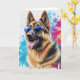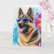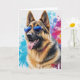 Tarjeta de saludo en blanco de un Pastor Alemán con gafas de sol geniales con un fondo de arte de salpicaduras.