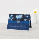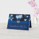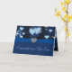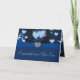 Hermosos tonos azules con flores, viñas y corazones flotando. Con un fondo azul, terciopelo azul como arco, y el embellecimiento del botón con forma de diamante en forma de corazón.