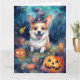 Tarjeta Corgi de Halloween con calabazas espeluznante
