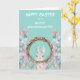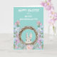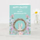 Un lindo conejito asoma desde una corona rodeada de flores primaverales rosadas y lavandas. El texto "Feliz Pascua a una dulce nieta" está en blanco en la parte superior. La imagen y el texto están colocados sobre un fondo verde azulado pastel primaveral. El interior de la tarjeta tiene otra linda imagen del conejito, y su texto personalizado en verde azulado a juego. Todo el texto se puede cambiar fácilmente, por lo que es una tarjeta maravillosa para enviar a una nieta, una sobrina o una hija.