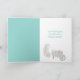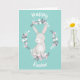 Un lindo conejito gris sentado dentro de una corona floral rosa, blanca y verde en la parte delantera de esta tarjeta de saludo de Pascua. El texto Feliz Pascua está en blanco en la parte superior e inferior. La imagen y el texto están colocados sobre un fondo verde azulado pastel de primavera. El interior de la tarjeta tiene su texto personalizado en verde azulado a juego, y otra imagen del conejo con una carretilla de flores.