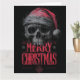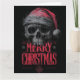 diseño gráfico audaz y mugriento que presenta una calavera muy detallada y dibujada a mano que está amenazadoramente coronada con un sombrero rojo de Santa deteriorado. La ilustración tiene una apariencia pesada, texturizada y ligeramente salpicada, sobre un fondo gris oscuro. Debajo de la calavera, las palabras "FELIZ NAVIDAD" se presentan en tipografía roja prominente y estilizada. Este diseño ofrece una interpretación única y alternativa de la temporada navideña.