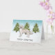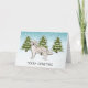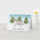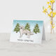 El original ilustracion personalizado de Destei de un lindo perro de raza Golden Retriever color crema inglesa. El perro es colocado en una escena invernal con tres abetos verdes y la caída de la nieve. El fondo es un degradado de azul a blanco que da al diseño ese aspecto frío del invierno. También hay un área de texto personalizable que ahora dice: "Feliz Navidad".