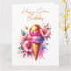 Gran tarjeta personalizada de cumpleaños dorado. Hermoso cono de helado rosa, púrpura y dorado y flores hechas en un estilo acuarela ai art.