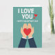 This card shows two stylized hands with soft shading and a gentle upward curve, holding a large crimson heart as if offering it with care 🥰❤️. The hands sit centered on a cool teal background, and the warm red heart stands out strongly against it. Above the heart, the words “I LOVE YOU” appear in white sans-serif letters, with two small red hearts nearby that echo the main heart and add a sweet, flirty touch. Below the hands, “HAPPY VALENTINE’S DAY” is set in the same white type, placed near the bottom to balance the layout. The simple shapes and tidy symmetry give the scene a modern look, while the cradling gesture suggests closeness and trust between two people. Dark blue suit sleeves frame the wrists, and small white cuffs peek out, hinting at a dressed-up moment of giving. The teal field stays flat and smooth behind everything, making the red heart, white lettering, and tiny red heart icons easy to spot.