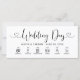Las modernas tarjetas de tiempo del día de la boda en blanco y negro presentan un diseño tipográfico elegante con iconos del evento del día de la boda, información del momento, guión de caligrafía de la moda y acentos cardíacos. El texto simple y elegante del personalizado que puede ser completamente personalizado con los nombres de la novia y del novio, la fecha del boda y los detalles de la cronología.