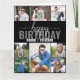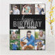 Tarjeta de cumpleaños personalizada para cualquier edad. La plantilla de fotos está lista para que añadas 8 de tus fotos favoritas y las personalizes con el nombre o la relación de la persona de cumpleaños, como papá, hijo, hermano, etc. Dentro, la tarjeta dice "feliz cumpleaños" y también tienes la opción de añadir tu propio mensaje de personalizado. Este diseño tiene un fondo negro con tipografía en blanco y gris.