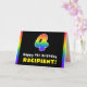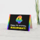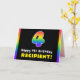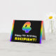 Este divertido y vibrante diseño de tarjetas de felicitación con temática de cumpleaños presenta un gran número "4" con un vibrante patrón de gradiente inspirado en el espectro de colores del arcoiris, junto con el mensaje "Feliz cuarto cumpleaños", y un nombre de destinatario personalizado. El interior presenta un mensaje de bienvenida de cumpleaños personalizado, o tal vez podría ser borrado y dejado en blanco si se va a escribir un mensaje a mano. Una tarjeta de felicitación alegre y personalizada de cumpleaños como esta podría ser usada para celebrar el cuarto cumpleaños de alguien. [~Z0000631]