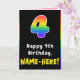 Este audaz y alegre diseño de tarjetas de felicitación con temática de cumpleaños presenta un gran número de "4" que tienen un vibrante patrón de gradiente inspirado en el espectro arcoiris, junto con el mensaje "Feliz cuarto cumpleaños", y un nombre de destinatario de personalizable. El interior presenta un mensaje de bienvenida de cumpleaños de personalizable, o tal vez podría ser borrado y dejado en blanco si se va a escribir un mensaje a mano. Una feliz tarjeta de felicitación de cumpleaños personalizada como esta podría ser enviada para celebrar el cuarto cumpleaños de alguien. [~Z0000627]