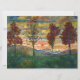 Este diseño presenta una pintura del artista expresionista austríaco Egon Schiele (1890-1918). Schiele fue un importante pintor figurativo de principios del siglo XX, que era un protegido de Gustav Klimt. Esta obra de arte muestra una hilera de cuatro árboles con hojas rojas; en el fondo hay un paisaje de colinas y montañas. En el cielo hay una hermosa puesta de sol roja, y el sol brilla como un naranja brillante. El título alemán de la pintura es "Vier Bäume", que significa "Cuatro Árboles", y ahora se encuentra en la colección del Belvedere de Viena, Austria. Se produjo por primera vez en 1917.