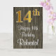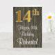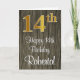 Este elegante, elegante y sofisticado diseño de tarjetas de felicitación con temática de cumpleaños presenta un gran número ordinal "14th" con un aspecto imitación/falso de inspiración dorada, junto con el mensaje de bienvenida de cumpleaños "Feliz 14th Birthday", y un nombre personalizado con un tipo de letra tipo script en el frente. El fondo de la fachada presenta un diseño falso inspirado en la madera. El interior tiene un mensaje de bienvenida de cumpleaños de personalizado, o tal vez podría ser borrado y dejado en blanco si un mensaje se va a escribir a mano en su lugar. Una lujosa tarjeta de felicitación de cumpleaños editable como esta podría ser usada para celebrar el décimo cuarto cumpleaños de alguien. [~Z0000519]