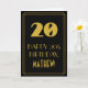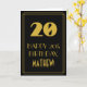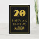Este diseño de tarjeta de felicitación temática de cumpleaños con estilo de época/retro y de la era de 1920-1930 presenta un gran número "20" inspirado en el estilo art déco, el mensaje "FELIZ CUMPLEAÑOS 20", un nombre personalizable y un patrón de borde que consiste en líneas delgadas en el frente. El fondo del frente es de color negro. El interior tiene un mensaje de felicitación de cumpleaños personalizado, o quizás podría estar en blanco si se desea escribir un mensaje a mano. Una tarjeta de felicitación de cumpleaños personalizada como esta podría ser una forma divertida de enviar buenos deseos a alguien que está celebrando su vigésimo cumpleaños. [~Z0000499]