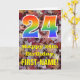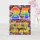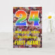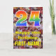 El frente de este diseño de tarjeta de felicitación de cumpleaños colorido, temático de otoño y de inspiración natural presenta un gran número "24" con un patrón de gradiente de espectro de arcoíris, junto con el mensaje "Feliz cumpleaños 24" y un nombre personalizado. El fondo de la parte frontal de la tarjeta presenta un patrón rústico de hojas de otoño caídas. El interior presenta un mensaje de felicitación de cumpleaños personalizado, o quizás podría estar en blanco si se desea escribir un mensaje a mano. Una tarjeta de cumpleaños personalizable como esta podría ser una forma divertida de enviar deseos de cumpleaños a alguien que está celebrando su cumpleaños número veinticuatro. [~Z0000384]