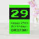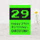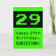 Este diseño de tarjetas de felicitación temática de cumpleaños geek y divertido incluye un gran estilo de computación de 8 bits verde número "29" en la parte delantera. También incluye el mensaje de bienvenida de cumpleaños "Feliz cumpleaños 29", y un nombre de personalizable. El interior presenta un mensaje de bienvenida de cumpleaños de personalizado, o tal vez podría ser borrado y dejado en blanco si se va a escribir un mensaje a mano. Una divertida tarjeta de felicitación de cumpleaños como esta podría ser usada para enviar deseos de cumpleaños a un ingeniero, un científico o alguien que disfruta de videojuegos retro y que está celebrando su vigésimo noveno cumpleaños. [~Z0000430]