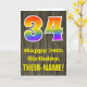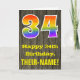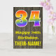 El frente de este diseño de tarjeta de felicitación de cumpleaños colorido pero rústico presenta un gran número "34" con un patrón inspirado en gradiente de espectro de arcoíris. También presenta el mensaje "Feliz cumpleaños 34" y un nombre de destinatario personalizable. La parte delantera presenta un fondo que representa un patrón de apariencia de grano de madera falsa rústica. El interior presenta un mensaje de felicitación de cumpleaños personalizado, o quizás podría estar limpio y dejado en blanco si se va a escribir un mensaje a mano en su lugar. Una tarjeta de cumpleaños personalizada como esta podría ser una forma divertida de celebrar el cumpleaños número treinta y cuatro de alguien. [~Z0000419]