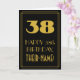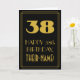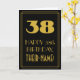 Este diseño de tarjeta de felicitación de cumpleaños con estilo vintage/retro y de la época de los años 20/30 presenta un gran número "38" con apariencia art déco, el mensaje "FELIZ 38º CUMPLEAÑOS", un nombre personalizado y un patrón de borde que consiste en líneas finas en la parte frontal. La parte frontal tiene un fondo de color negro. El interior tiene un mensaje de felicitación de cumpleaños personalizado, o quizás podría estar en blanco si se desea escribir un mensaje a mano en su lugar. Una tarjeta de felicitación de cumpleaños personalizada como esta podría ser utilizada para celebrar el trigésimo octavo cumpleaños de alguien. [~Z0000499]