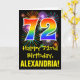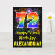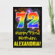 El frente de este divertido, emocionante y colorido diseño de tarjetas de felicitación con temática de cumpleaños presenta un gran número "72" con un patrón inspirado en el gradiente del espectro del arco iris, junto con el mensaje "Feliz cumpleaños número 72", y un nombre de destinatario personalizado. En el frente también hay un colorido patrón de fondo inspirado en el aspecto de los fuegos artificiales de celebración. El interior presenta un mensaje personalizado de bienvenida de cumpleaños, o tal vez podría ser borrado y dejado en blanco si se va a escribir un mensaje a mano. Una tarjeta de cumpleaños de personalizable como esta podría ser una manera divertida de enviar un mensaje para celebrar el 72 cumpleaños de alguien. [~Z0000442]