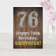 El diseño de la tarjeta de felicitación temática de cumpleaños inspirado en el país y el estilo americano Wild West presenta un gran estilo rústico con el número "76", el mensaje "Feliz Cumpleaños 76", un nombre personalizado, y un diseño inspirado en los motivos de la silueta de los granos de madera. El interior tiene un mensaje de bienvenida de cumpleaños de personalizado, o quizás podría ser borrado y dejado en blanco si un mensaje se escribe a mano. Una tarjeta de felicitación de cumpleaños como esta podría ser una manera divertida de enviar algunos deseos de cumpleaños a alguien que está celebrando su cumpleaños setenta y seis. [~Z0000469]