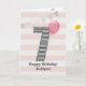 Tarjeta de cumpleaños número 7 con purpurina rosa y plateada para niñas, que se puede personalizar con su nombre. La parte frontal de esta tarjeta de cumpleaños número 7 para ella presenta el número siete en una franja negra y blanca con un contorno de purpurina con un globo rosa listo para flotar. Tenga en cuenta que la purpurina es un efecto de diseño y no habrá purpurina real en esta tarjeta de cumpleaños. El fondo es suave blanco y rosa con un banner dorado en la parte superior. El mensaje interior se puede personalizar fácilmente si lo desea. Una tarjeta de cumpleaños número 7 única para nieta, hija, sobrina, etc.
