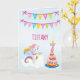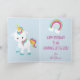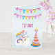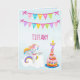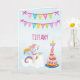 Hecho para una niña de 7 años, esta tarjeta de cumpleaños de unicornio es increíble. Mostrada en un fondo azul claro, hay una pancarta rosa, azul y amarilla que anuncia "Feliz Cumpleaños". Su nombre está personalizado en el centro de la tarjeta de cumpleaños utilizando fuente rosa. Un unicornio blanco con alas volando en una nube está en la parte inferior izquierda de la tarjeta. El número 7 está en la parte superior con una vela de cumpleaños. ¡Haga su pedido hoy!