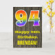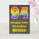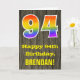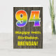 La parte delantera de este colorido pero rústico diseño de tarjetas de felicitación con temática de cumpleaños cuenta con un gran número de "94" con un diseño inspirado en el gradiente del espectro del arcoiris, junto con el mensaje "Feliz cumpleaños 94", y un nombre de destinatario del personalizable. En la parte delantera hay un fondo que representa un estilo rústico de grano de madera. El interior presenta un mensaje de bienvenida de cumpleaños personalizado, o tal vez podría ser borrado y dejado en blanco si se va a escribir un mensaje a mano. Una tarjeta de cumpleaños personalizada como esta podría ser una manera divertida de enviar deseos de cumpleaños a alguien que está celebrando su cuarto cumpleaños. [~Z0000419]