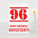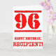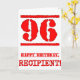 Este divertido diseño de tarjetas de felicitación de cumpleaños incluye un gran número rojo "96" con un sello de goma inspirado en la apariencia, además del mensaje de bienvenida de cumpleaños "FELIZ CUMPLEAÑOS", y un nombre de personalizable en la parte delantera. El interior tiene un mensaje de bienvenida de cumpleaños personalizado, o tal vez podría ser borrado y dejado en blanco si se va a escribir un mensaje a mano. Una divertida tarjeta de felicitación de cumpleaños de personalizable como esta podría ser una manera divertida de dar saludos de cumpleaños a alguien que está celebrando su cumpleaños noventa y seis. [~Z0000524]