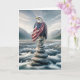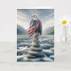 Un águila calva envuelta en una bandera americana está posada en la parte superior de un cairn de piedra en medio de un río que fluye rodeado de montañas para un cumpleaños.