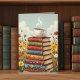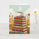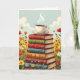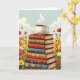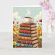 Una tarjeta de cumpleaños dulce para un amigo o familiar que ama el café y la lectura. El ilustracion de la tarjeta es una pila de libros antiguos con una taza de café caliente y humeante en la parte superior rodeada de flores.