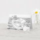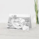 Tarjeta de bienvenida Color Me Birthday con una linda imagen de un gato dormido y un gran ratón con un gorra fiesta que se cuela desde un lado. El gato está durmiendo en su cama, que está en un suelo de madera. En el fondo se puede ver una puerta de la casa del ratón y un cartel que dice "Bendito este ratón" colgando al lado. Imagen en blanco y negro que se puede colorear o enviar a alguien para que coloree por su cumpleaños. ¡Ideal para niños, adolescentes o adultos! Tarjeta de felicitación por cumpleaños. Arte, imagen y verso copyright © Shoaff Ballanger Studios.