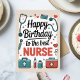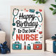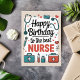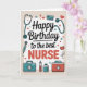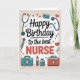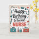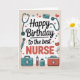Este diseño personalizado de la tarjeta de cumpleaños de la enfermera incluye las palabras "Feliz cumpleaños a la mejor enfermera". Estas palabras están rodeadas de varias herramientas médicas y una frontera rosada. El interior de la tarjeta dice "Deseándote el mismo cuidado y amabilidad que dás todos los días. ¡Feliz cumpleaños!". Puedes añadir tu nombre al interior de esta tarjeta. ¡Disfrútalo!