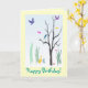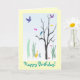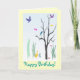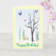 Esta tarjeta de cumpleaños crea un ánimo de primavera colorido y caprichoso. Los pájaros vuelan y están encaramados en el árbol. Las mariposas cuelgan en el aire cálido. Un pato camina en el pasto. Incluso hay un pequeño caracol en el suelo. El texto dice: ¡Feliz cumpleaños! Deseándote paz y alegría en tu día especial... Se puede personalizar según tus necesidades.