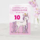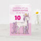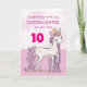 Un lindo poni rosa como tu ahijada está brincando con el número diez. Detalles con apariencia dorada están entretejidos en su crin y cola. ¡Tarjeta perfecta para desearle un feliz cumpleaños a tu ahijada!