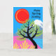 El texto del frente es Feliz cumpleaños de primavera. En la portada de la tarjeta se presentan coloridos saludos de cumpleaños con plantas simplificadas, formas naturales, el Monte Fuji y un sol rojo. Arte, imagen y verso © Shoaff Ballanger Studios, 2024.
