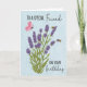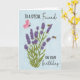 Esta es una tarjeta de cumpleaños con una planta de lavanda que tiene dos abejas y una mariposa volando por ahí. El fondo es un azul claro con una textura nublada y el texto, ‘A un Amigo Especial en tu Cumpleaños’.