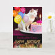 Tarjeta de saludo de papel de cumpleaños para una ahijada. Añade su nombre a la cubierta de la tarjeta. Un gato blanco sostiene globos coloridos y mira fijamente una vela de pastel de cumpleaños. Arte, imagen y verso copyright © Shoaff Ballanger Studios, 2023.